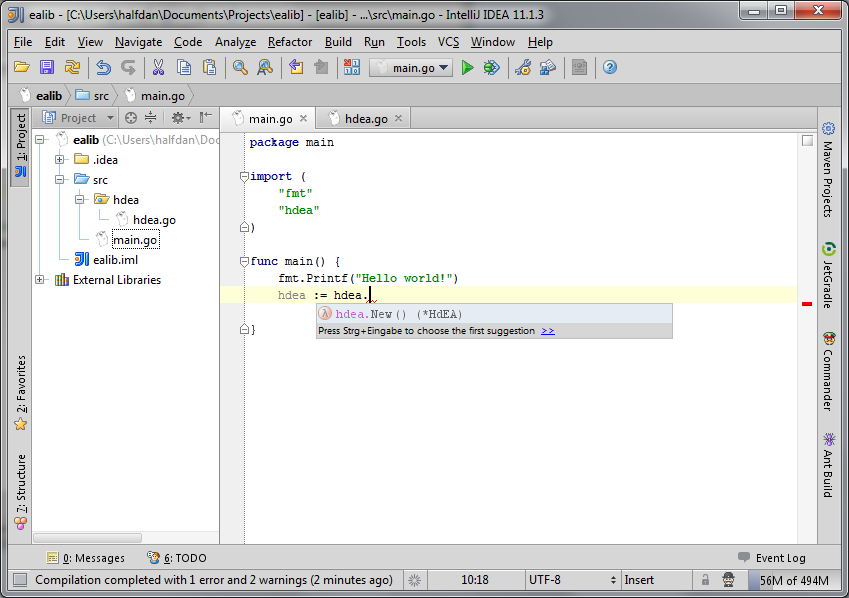 IntelliJ IDEA is an IDE by Jetbrains and very popular among Java developers. The Go plugin comes with syntax highlighting, code completion, automatic builds and sublibrary support. This makes it easy to split your project into several packages while still browsing them in a single IDE project.