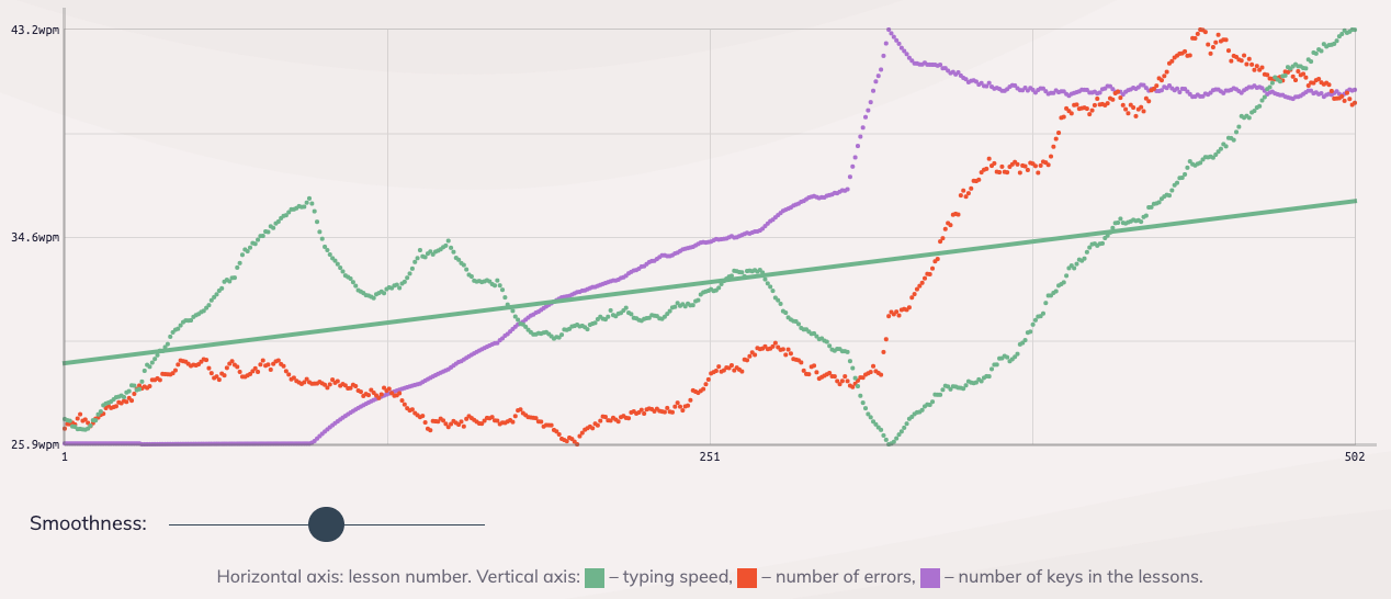 There's visible progress, and I have just added the last remaining letters to the practice set. I'm nowhere near my average typing speed, but I'm also just using the keyboard for about an hour every day so far.